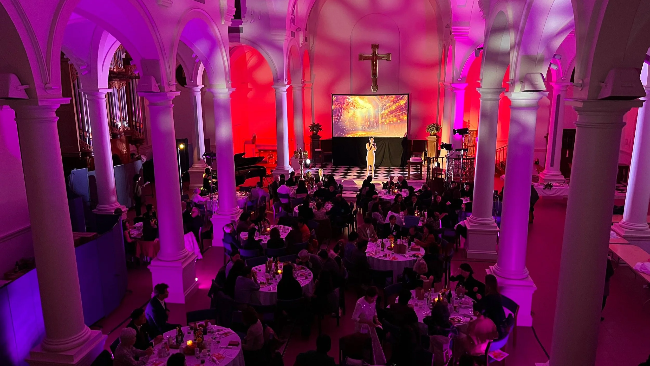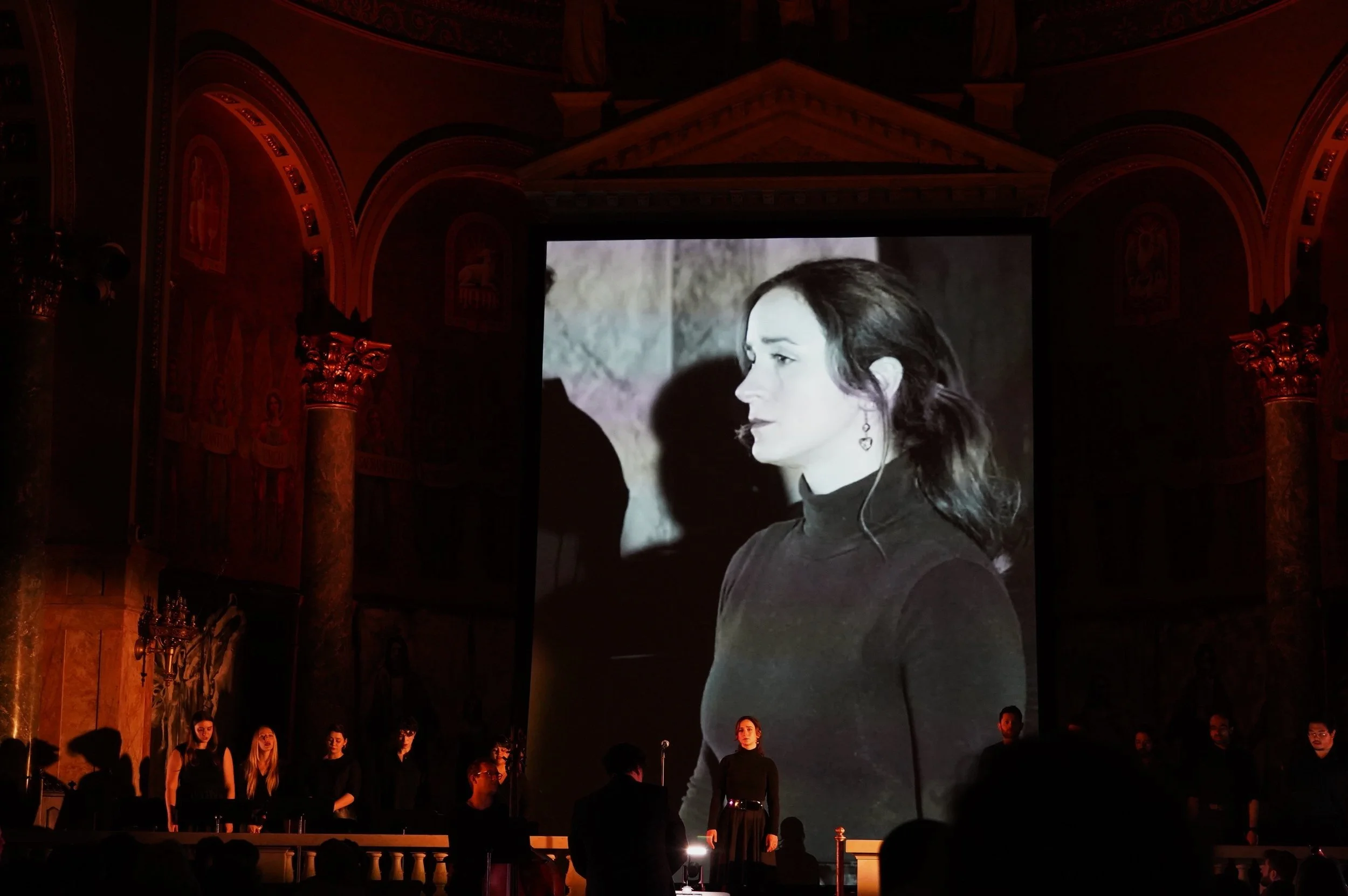 300-inch screen projection using the Panasonic RZ120( 12k Lumens) projector with an ET-DLE350 zoom lens. Background projection for El Oratorio Panhispánico, part of MACC 2025.