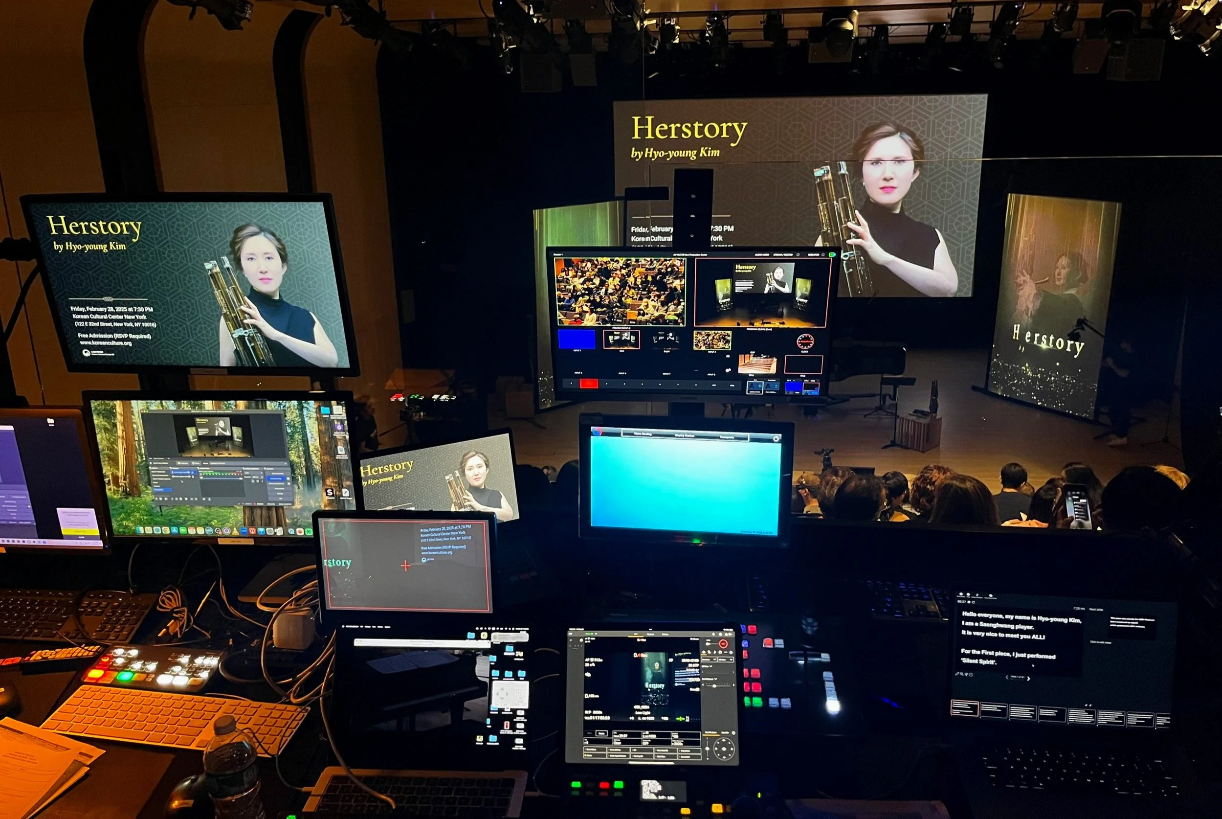 Three-projector, three-screen installation at KCCNY, creating an immersive visual experience.